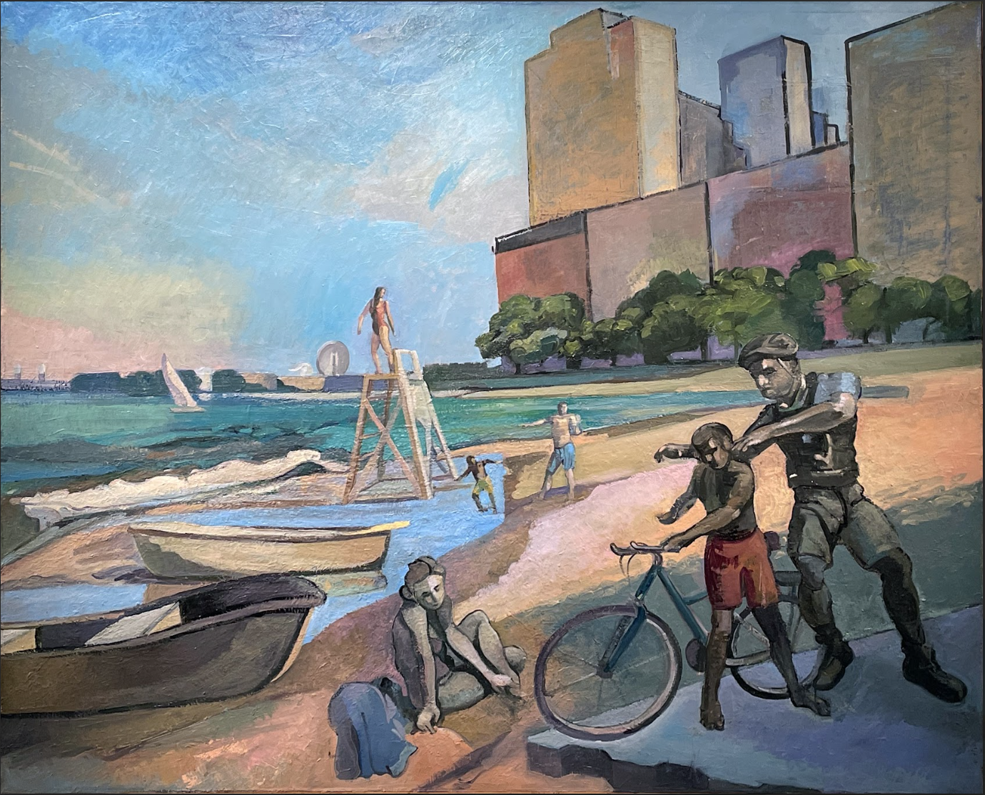 The landscape painter who is focused on the natural world might think of their subject matter as natural light and natural forms of the world, or the electric lights and the manmade angles of the city. But for those unoccupied scenes, well…where are the people? Do we really think that the landscape painter is always alone out there, without a single soul with whom to cohabitate, just because no figures are in their paintings? The keepers of these places where we exist–the landscapers, custodians, doormen, security guards–their job is to know, to care for, and to maintain the space. Integral to their work, they witness. A couple walking hand in hand. An argument between two colleagues. A person noticing moments too late that they’ve just been pickpocketed. A marriage proposal. In his hours and hours of painting en plein air, Tim King also witnesses, and these works incorporate his memories of events that took place in the locations he most often paints. He writes, “They all came out of older studies started up to 25 years ago. All are from experiences while painting landscapes in plein air where I witnessed actions, events and lifestyles that have been stuck dwelling in my head.” A guy fishing, a homeless man, a lifeguard saving a drowning boy, and many other events are things that he has witnessed while he’s been out on site, painting the landscape.